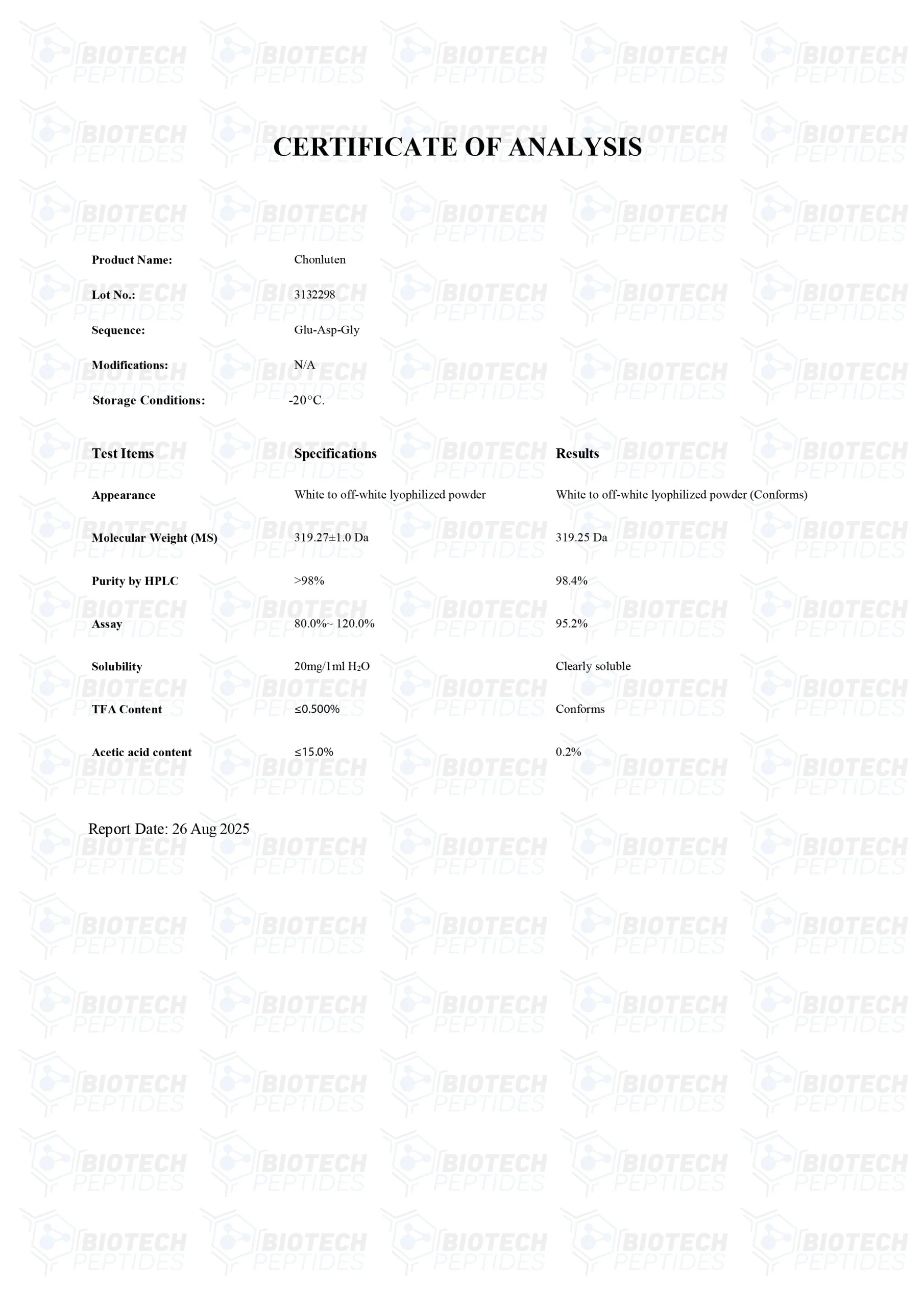 Direct from the lab. For research use only. This is Chonluten, also known as tripeptide T-34 (Glu-Asp-Gly sequence). We stock it because the research on its targeted action is compelling. It’s a precise tool for studying cellular response in pulmonary and gastrointestinal tissues.